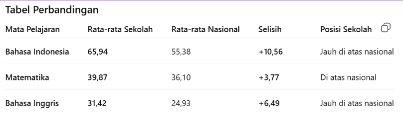 Semoga hasil ini juga menjadi dasar yang kuat dalam penetapan diterimanya peserta didik eligible jalur rapor atau jalur tes lainnya, sekaligus pijakan penting bagi perencanaan program peningkatan mutu pembelajaran pada tahun berikutnya.