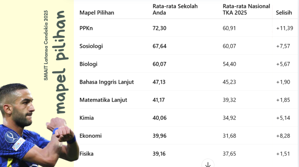 Hasil TKA juga memperlihatkan performa yang baik pada mata pelajaran pilihan. Mapel rumpun IPS seperti PPKn dan Sosiologi menunjukkan rata-rata yang sangat kuat, masing-masing 72,30 dan 67,64, menjadikannya sebagai keunggulan utama sekolah. Biologi berada pada rata-rata 60,07, mencerminkan penguasaan konsep yang cukup baik meskipun masih memerlukan penguatan pada sebagian peserta didik.